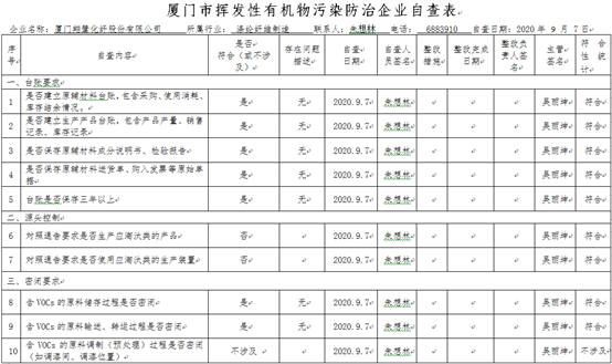 廈門市揮發性有機物污染防治企業自查表(2020年第二季度)